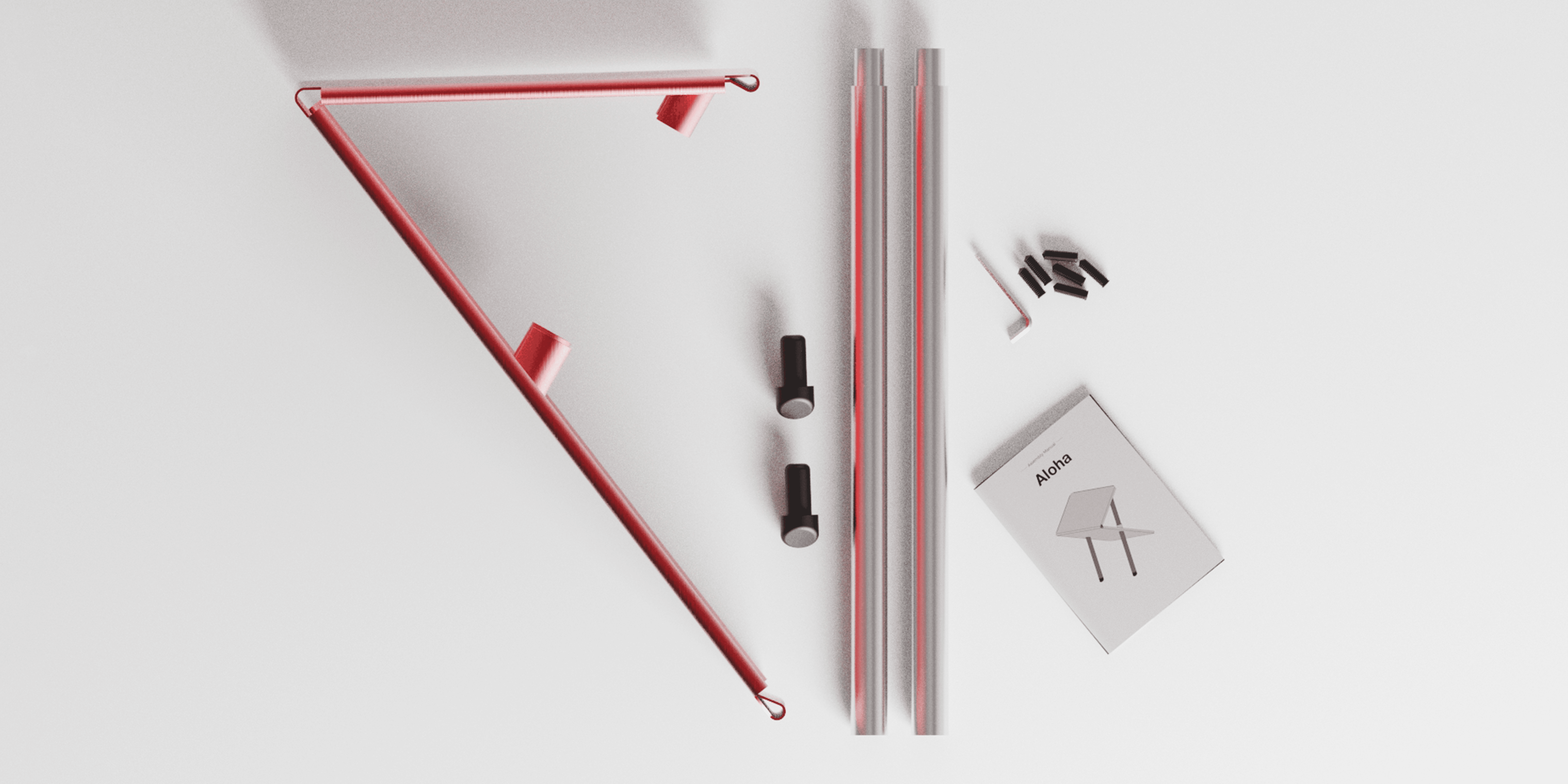 Aloha is crafted from anodizing grade aluminum (8011), 1.5mm thick sheet metal and 30mm dia aluminium pipes. Precision flush fittings by turning the pipes on lathe and grub screws ensure secure assembly. Its flat-pack design allows for easy assembly, and despite its robust metal construction, Aloha is exceptionally lightweight at just 3.5 kilograms. Aloha have various anodized color options like black, red, persian blue, olive green and gold.
