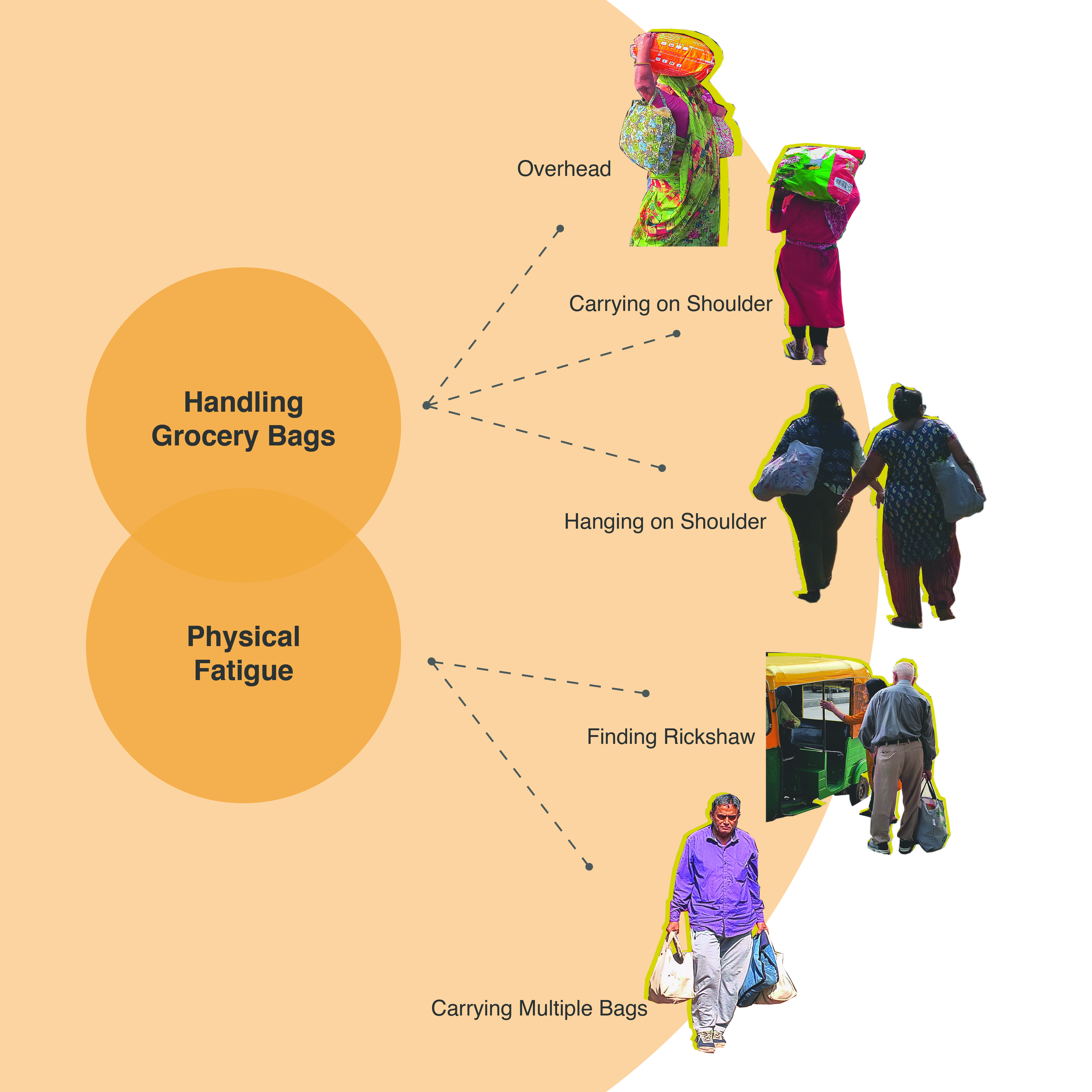 Handling revealed another critical gap. Users struggled with flimsy straps, collapsing forms, and discomfort while carrying heavy, uneven loads especially over longer distances or on two-wheelers. This highlighted the need for better grip, balanced load distribution, and a form that holds itself while remaining light and collapsible.