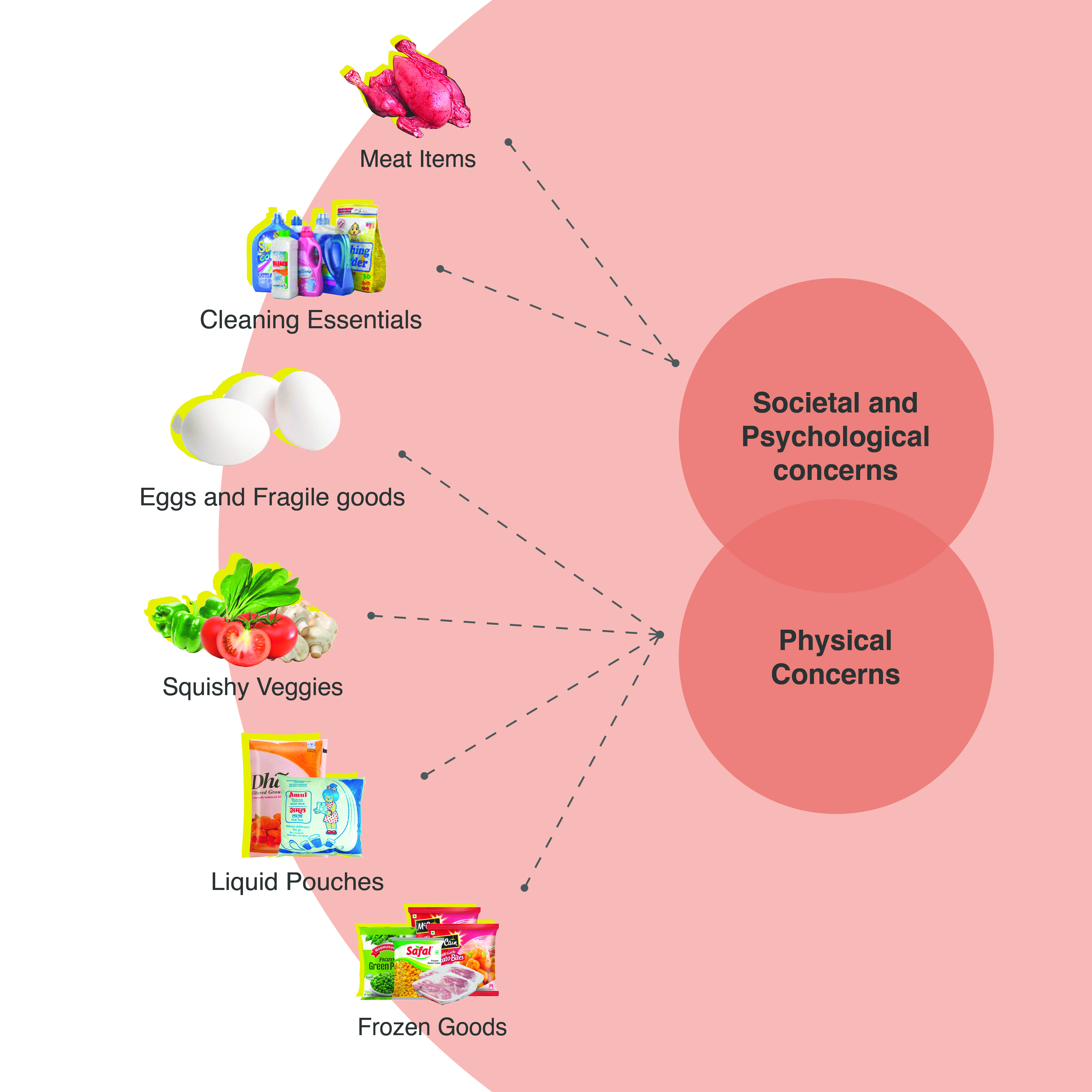 Segregation was a key challenge in everyday grocery routines. Users naturally grouped items fresh produce, dry goods, and fragile products, but existing bags lacked structure to support this. This led to disorganized packing and frequent damage. The insight pointed to a need for subtle internal divisions that guide intuitive segregation without complicating use.
