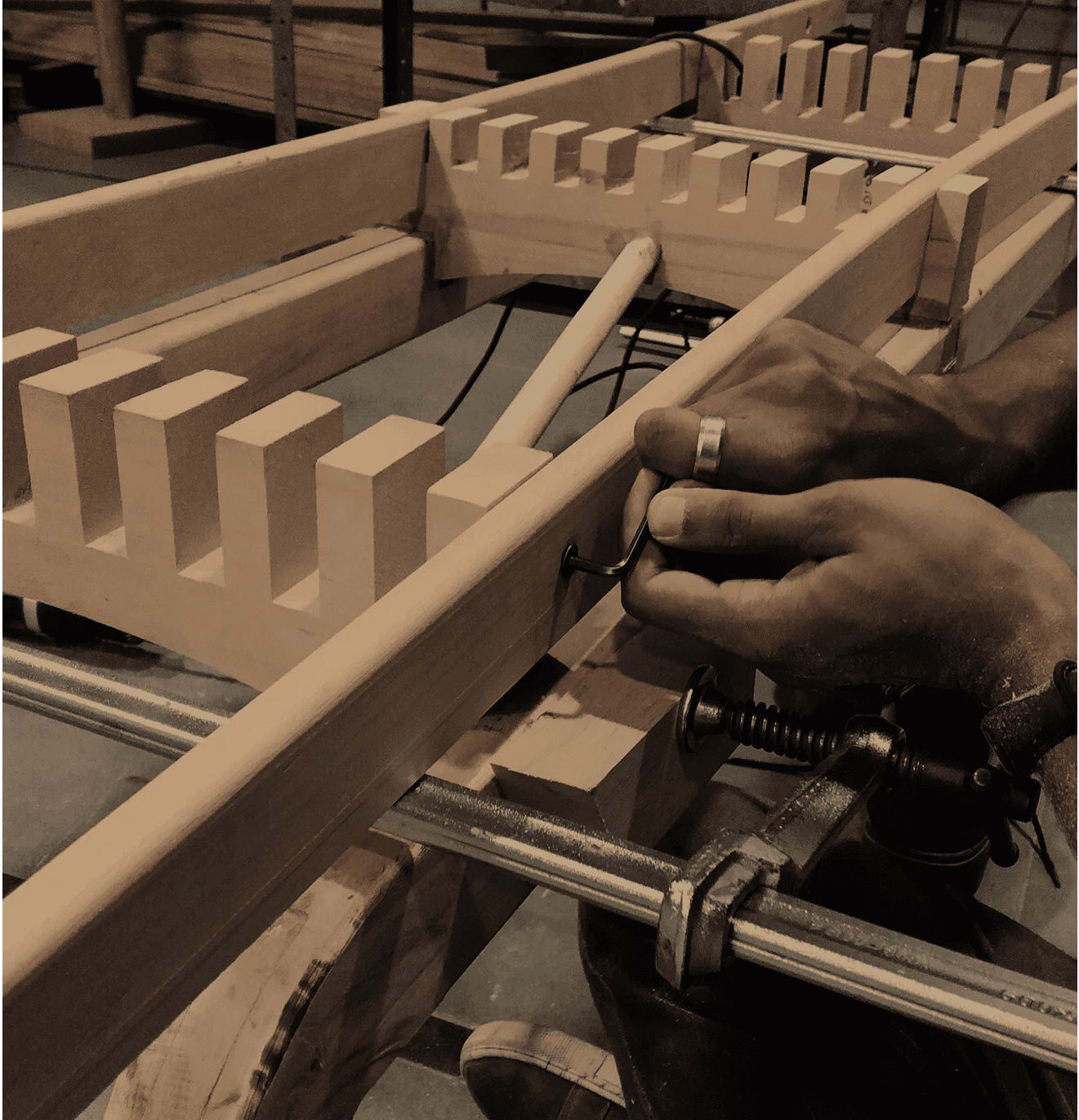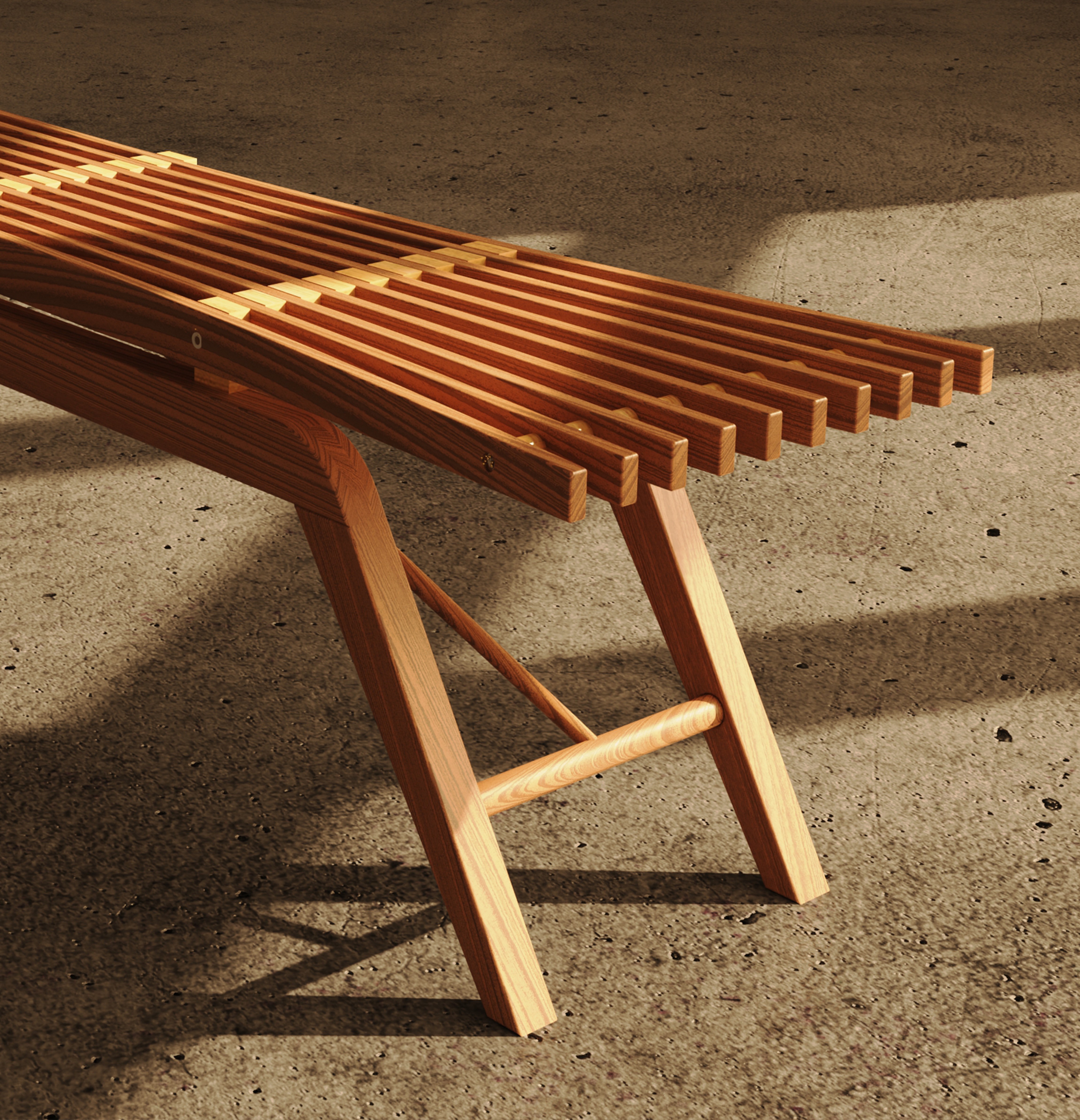 The form of Tranquil emerges from the inherent behavior of wood, shaped through two key gestures — tapering and splitting. Tapering allows for structural efficiency, reducing material where strength remains uncompromised, while splitting flanges the wood outward, expanding the seating surface without adding mass. Crafted in steam beech and finished with a warm coffee stain, the bench carries a soft matte texture that deepens its natural grain and presence.
